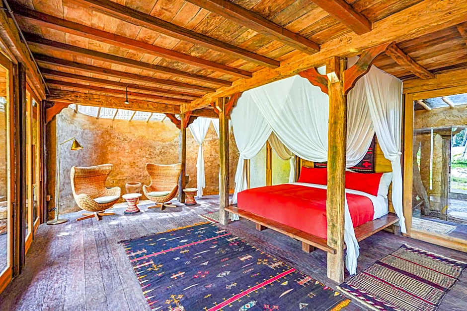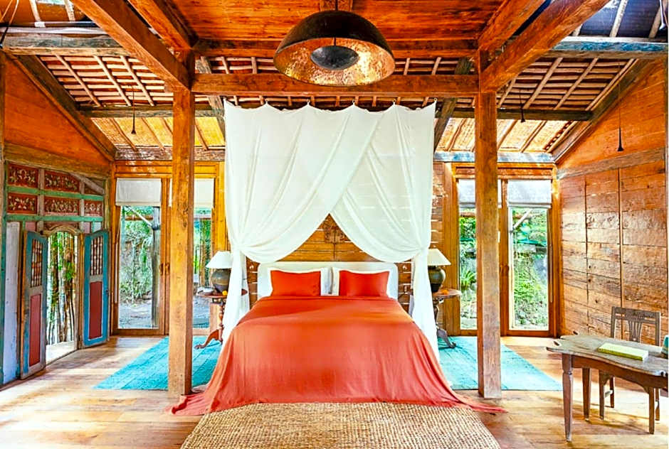 This spacious and antique wooden teak house is surrounded by thick and lush greenery. Tastefully decorated with antique furnishings, the house oozes an atmosphere that is akin the opulence of early Javanese royalty. There is a gazebo where guests can enjoy a lazy afternoon. The air-conditioned bedroom comes with a comfortable four-poster bed and a seating area. Featuring a semi-open shower facility, the private bathroom also provides free toiletries, Mini-bar, towels, and linen are also provided Please note that this unit can accommodate 1 extra bed.