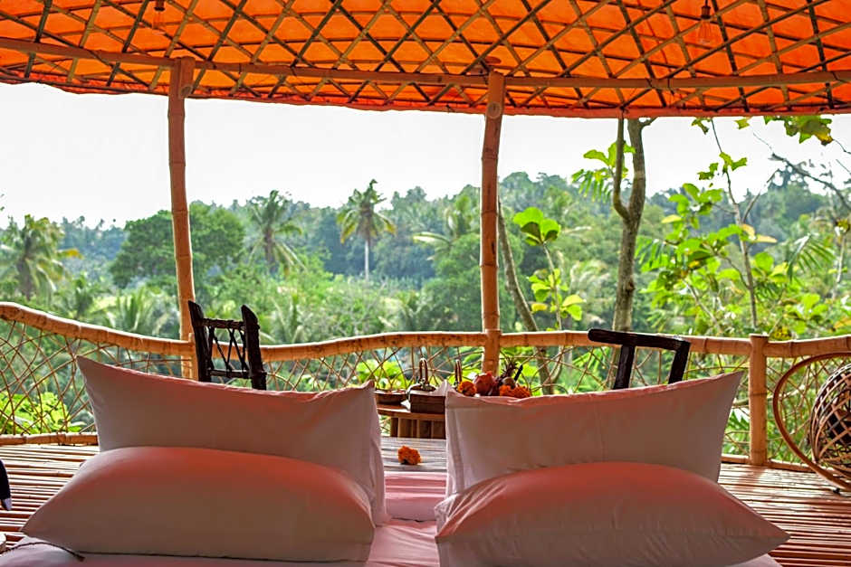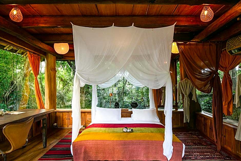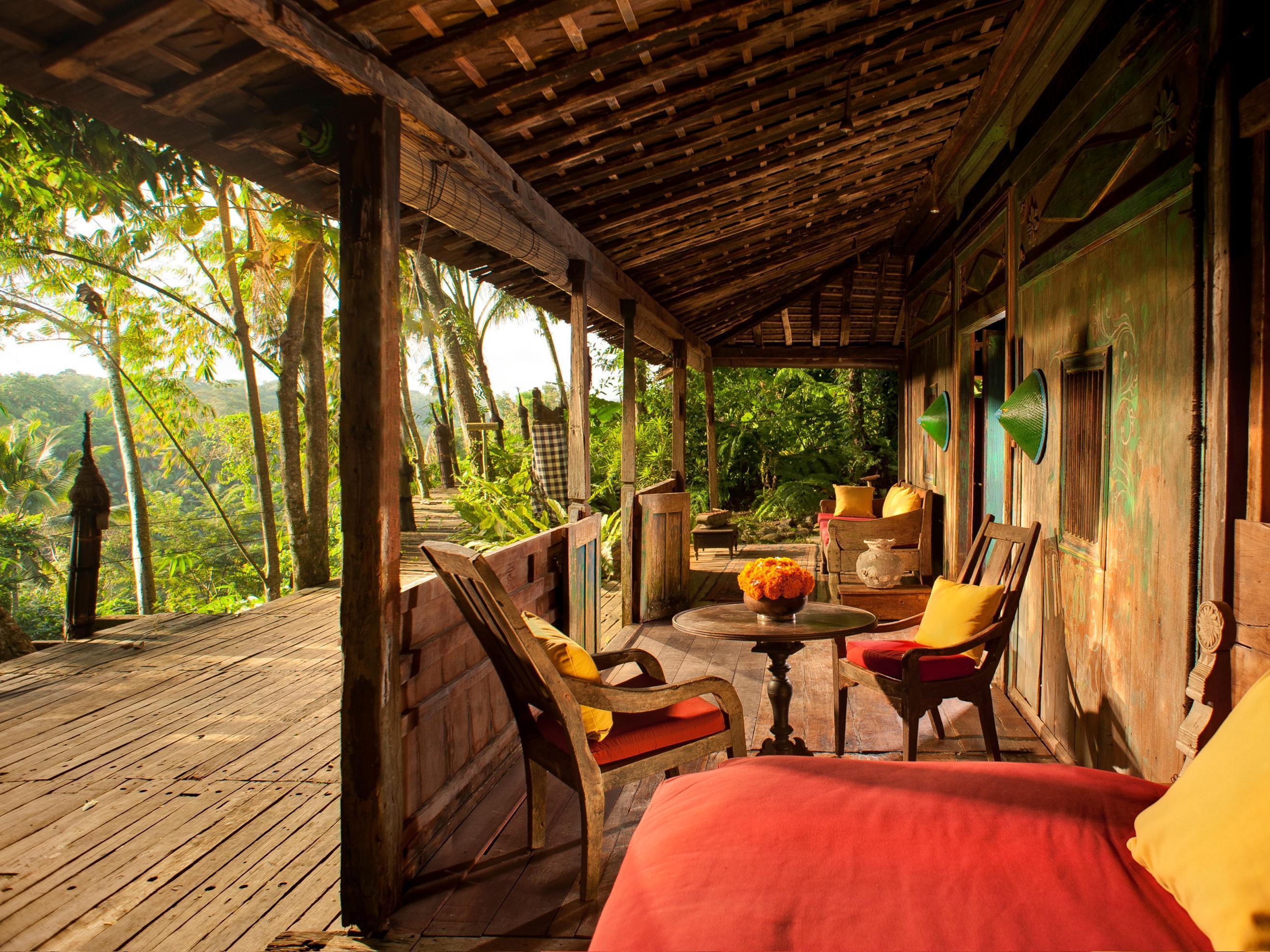 Named after John's children, Elora and Orin is a two story house that was originally part of their private home. The beloved bedrooms were such a delight to grow up in that we could not resist but to lovingly relocate them to Bambu Indah for you and your family to enjoy. This wooden two-story house is warm and inviting, perfect for families of 4 or groups of friends. Both bedrooms are complete with one outdoor and one indoor bathroom. Spend the afternoon nuzzled in a couch on the deck, looking out onto the gardens.