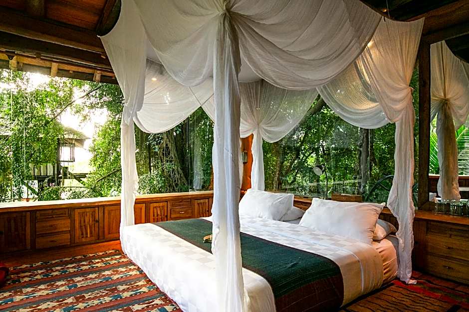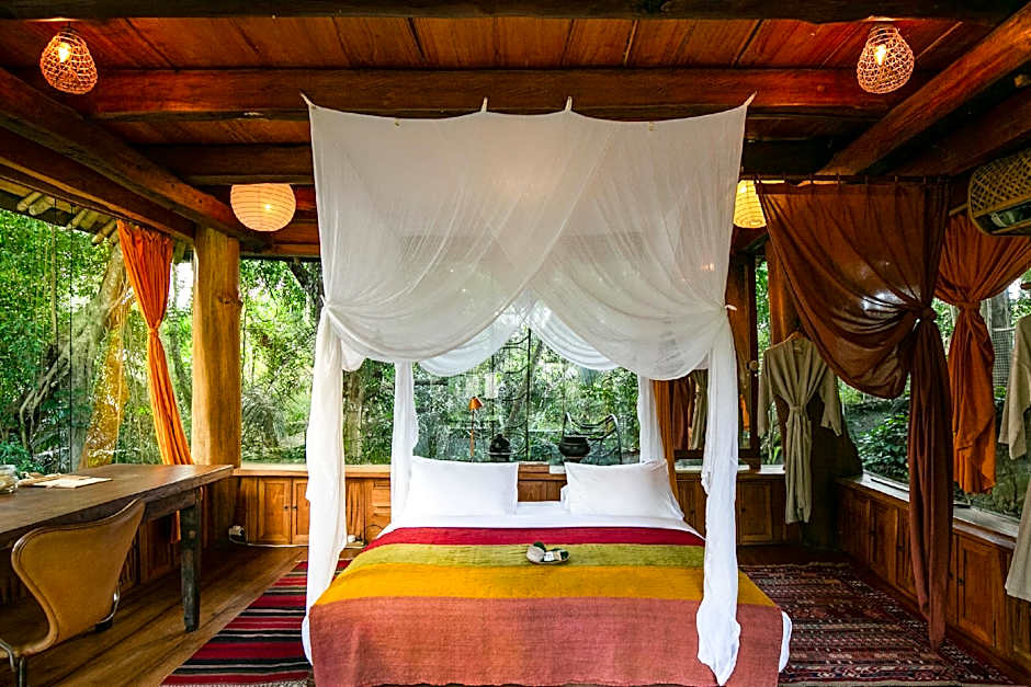This large and lovely wooden house offers a picturesque view of the famed Sayan Ridge. The house features a terrace with seating area and a deck where guests can enjoy a morning private yoga session or simply relax during lazy afternoon while listening to the calming sound of the Ayung River. Guests can also enjoy a meal at the outdoor dining area. The air-conditioned bedroom features a high ceiling and a canopied four-poster bed. There is also a spacious private bathroom with shower facility and free toiletries. Mini-bar, fresh towels and linen are provided in the room. Jawa Lama means “old java,” and is located in a shady alcove above the cliff, on a secluded nook looking up at the Treehouse. Walk outside to a spacious wooden deck perfect for yoga or simply relaxing. Jawa Lama is a comforting homage to the bygone eras of Southeast Asia as well as a stunning nod to Javanese nobility. Perfect as a honeymoon suite for couples or simply to indulge in this rare, scenic home away from home.
