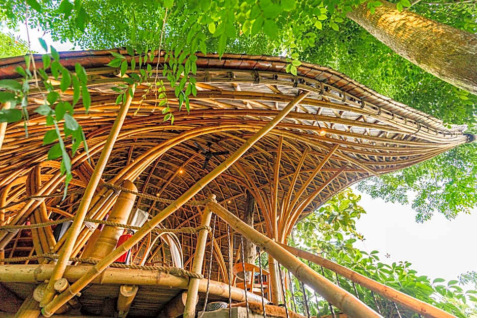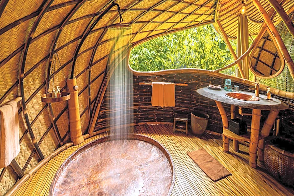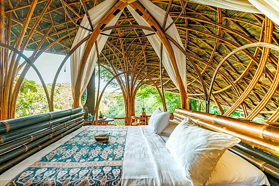 Introducing the Sumba house, a fusion of traditional Sumba heritage and modern massive bamboo engineering. Inspired by our love for Sumba island and Sumba houses in particular, we embarked on a journey to preserve and re-create their essence. This house, with its roof reaching 49 ft in height ,replicates every aesthetic remarkable Influence endemic to the original design. With minimal alterations, including a second floor sleeping area and private bathroom (accessible by a strong, beautiful bamboo ladder) our Sumba house is both traditional and comfortable. The windows and skylights delicately filter sunlight, illuminating the space with a mesmerizing glow. The air conditioned beds offer ultimate comfort, and the various lounging areas decorated with Sumba textiles beckon you to dream. Embrace the lights, filters and feel of this massive bamboo Museum. Perfect for families, embark on, and unforgettable indoor retreat, a perfect getaway for those seeking a unique connection to an indigenous tribal culture that has moved us profoundly for the past 30 years.